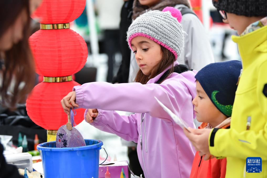 10月25日,在瑞士首都伯尔尼,小朋友在“遇见中国”文化节上体验制作漆扇。