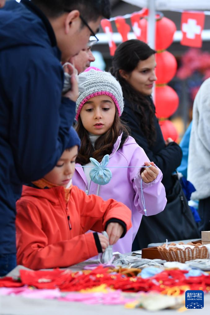 10月25日,在瑞士首都伯尔尼,小朋友在“遇见中国”文化节上体验制作香囊。