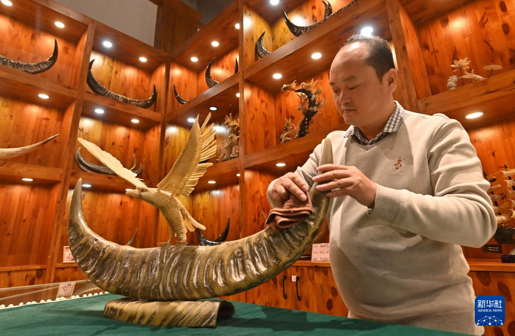 12月16日,宾阳武陵牛角制品制作技艺传承人龙顺周在武陵牛角工艺制品示范基地护理牛角工艺品。